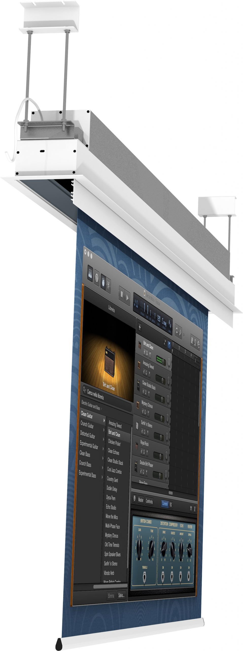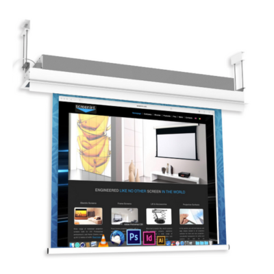 – Screen standard supplied with cloth dropping down from the front side of the housing